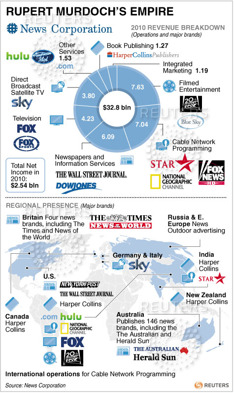 And here is a Reuters ( 7 July 2011) infographic that captures Murdoch's Global Media Empire