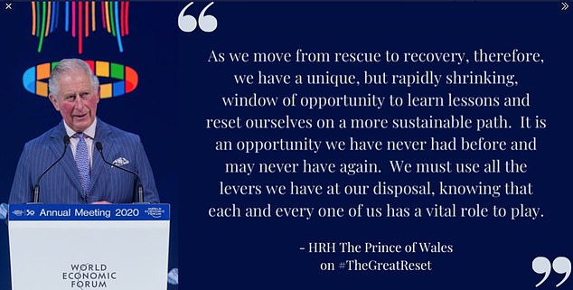 ‘Prince Charles made an impassioned speech at the World Economic Forum's virtual meeting yesterday, where he stressed the importance of using the outcome of the pandemic to reset the global economy. The royal spoke about the need to prioritise sustainable development without damaging the environment.