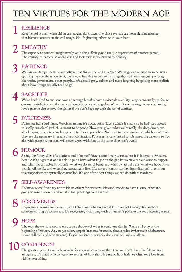 Why does being ‘a good person’ have such a bad name? In the modern world, the idea of trying to be good or kind conjures up all sorts of negative associations: of piety, solemnity, bloodlessness and sexual renunciation. It’s telling that ‘wicked’ has even become a term of praise.And yet the project of being good is as vital, or even more important, for the individual and society as is the project of being healthy. Yet while we have no problem with going to the gym to get fitter, it sounds deeply weird, even creepy, to suggest that one might ‘work’ at being better or nicer.
