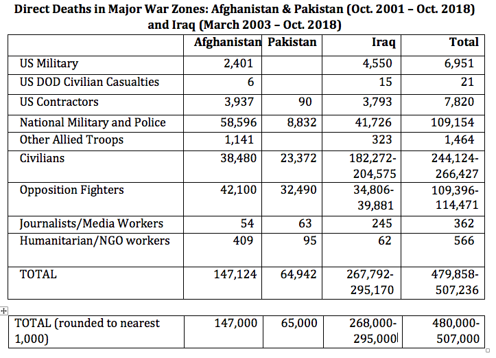- Over 480,000 people have died due to direct war violence, including armed forces on all sides of the conflicts, contractors, civilians, journalists, and humanitarian workers.